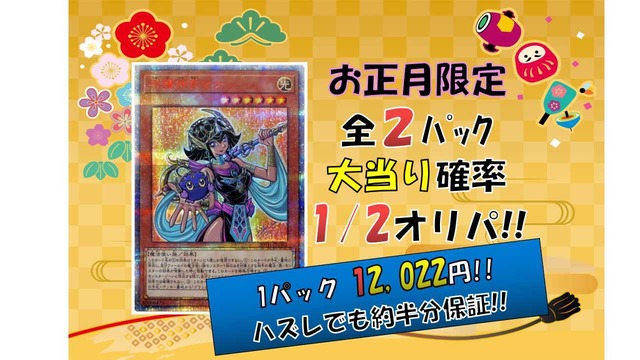 商品概要 【遊戯王OCG】のカードを封入したオリパです。 2022年好評だったニブイチオリパを2023年も開催! 2023年お正月限定!全2パック当たり確率1/2の激アツオリパです! ☆購入制限はおひとり様1パックです!☆ 2023年最初の勝負してみませんか! ※2022年同様、BASEで1パック、Twitter(@card_senka)のDMで1パックの合計2パックとなります。 Twitterの場合は支払い方法は銀行振込のみのご対応になりますが2023円引きで販売いたします。 12/30午前0時~12/30午後24時までDMでご予約可能です。(申込者の中から抽選。購入権獲得者様に12/31中にDMにてお伝えします) 万が一キャンセル分が出た場合は昨年同様BASEでキャンセル分をTwitter告知なしで販売いたしますのでお気に入り登録をお願いします。 封入カード 【大当たり】 ・【俱利伽羅天童】プリズマ 【はずれ】 ・オリパ価格の程4~5割程度になるようにシングルカード1~2枚 例)オリパ価格10万円の場合、4~5万円 【発送方法】 レターパックライト 【注意事項】 ・入金後の返金はお受けできません。 ・発送は完売後1/13を目安の予定です。 ・発送後のトラブルに関しては当店は一切責任を負いません。 ・当店のオリジナルパックは各種サイト様の販売価格(カードラッシュ様、遊々亭様など)を参考に作成しております。(2022/12/26時点) ・当店のオリジナルパックは当たり、外れが存在します。