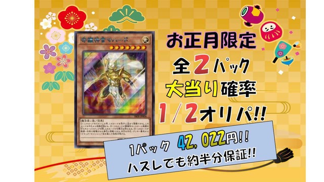 商品概要 【遊戯王OCG】のカードを封入したオリパです。 2022年好評だったニブイチオリパを2023年も開催! 2023年お正月限定!全2パック当たり確率1/2の激アツオリパです! ☆購入制限はおひとり様1パックです!☆ 2023年最初の勝負してみませんか! ※2022年同様、BASEで1パック、Twitter(@card_senka)のDMで1パックの合計2パックとなります。 Twitterの場合は支払い方法は銀行振込のみのご対応になりますが2023円引きで販売いたします。 12/30午前0時~12/30午後24時までDMでご予約可能です。(申込者の中から抽選。購入権獲得者様に12/31中にDMにてお伝えします) 万が一キャンセル分が出た場合は昨年同様BASEでキャンセル分をTwitter告知なしで販売いたしますのでお気に入り登録をお願いします。 封入カード 【大当たり】 ・【IPマスカレーナ】20th 【はずれ】 ・オリパ価格の程4~5割程度になるようにシングルカード1~2枚 例)オリパ価格10万円の場合、4~5万円 【発送方法】 レターパックライト 【注意事項】 ・入金後の返金はお受けできません。 ・発送は完売後1/13を目安の予定です。 ・発送後のトラブルに関しては当店は一切責任を負いません。 ・当店のオリジナルパックは各種サイト様の販売価格(カードラッシュ様、遊々亭様など)を参考に作成しております。(2022/12/26時点) ・当店のオリジナルパックは当たり、外れが存在します。